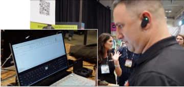 NaqiLogix社は、微妙な首や表情の動きでパソコンのキーボードなどを操作できるEarbudsのようなデバイス(写真5の右の写真)を開発している。NaqiLogix社のCo-FounderのJohn Occhipinti(以降、John)さんが会場で名刺の情報をパソコンに入力するデモを見せてくれたが、傍目にはじっと名刺を凝視しているだけにしか見えなかった。