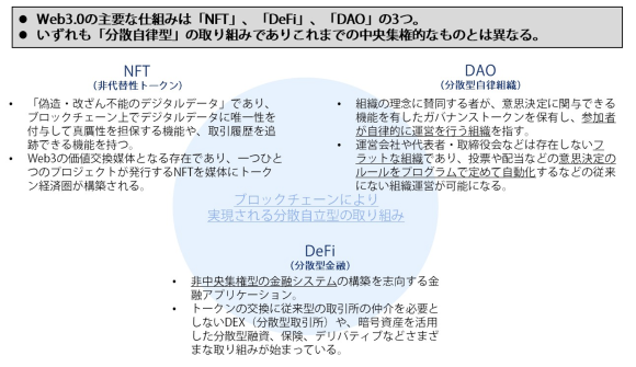NFT、DAO、DeFiの説明文を引用のうえ筆者作成、下線は筆者による https://www.projectdesign.jp/articles/4523aed5-06ec-439f-89a3-1722ba1a142f)