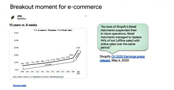 先述したソリューション以外にも、アフターコロナ時代のNew Normalを実現するソリューションは数多く提案されている。Google社のUzma氏は、基調講演で「Microsoft社は、『この2カ月間のデジタルトランスフォーメーションは2年分に相当する』と同社の第3四半期の決算発表で説明している。」と話をしてくれた。米国のある調査会社は「eコマースの普及率を見ると、過去10年間の伸び率をこの3カ月で超えた。」と発表している。おそらく、デジタルトランスフォーメーションの加速はさまざまな業界で進むであろう。