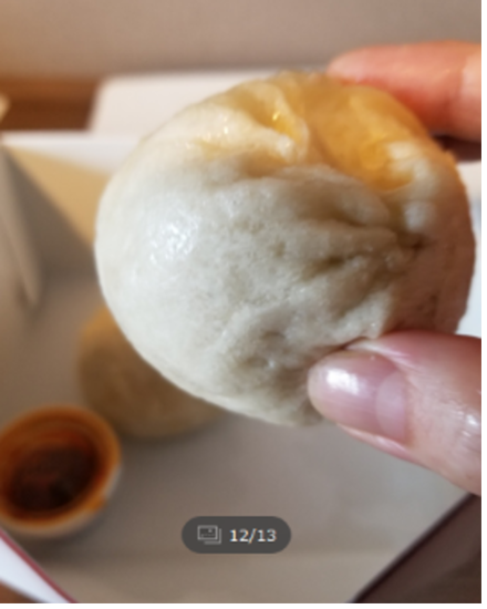 豚まんの最小単位は6個入りですが、偶然、期間限定で中華料理店とのコラボ商品として2個入りセットが売られており、購入しました。ひとつは四川風ソースでいただくピリ辛味、もうひとつは高麗人参などの漢方食材が入った健康に良さそうな薬膳豚まんです。一般的な豚まんより小ぶりですがボリューム満点、2つでおなかいっぱいです(写真1、写真2)。