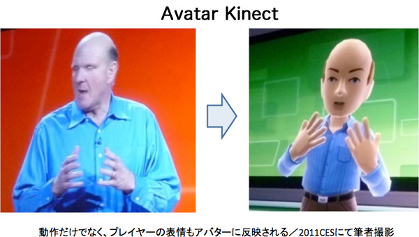 モーションセンサーというと任天堂のWiiを思い出す人が多いかもしれないが、Wiiとは違い、Kinectはリモコンを使用せず、人の動作を直接認識する。リモコンを利用しないモーションセンサーには高度な技術が必要なため、製品化は遅れたが、より多くの用途に対応できるというメリットをもたらした。 例えば、プレイヤーの全身を認識することで複雑な動作のセンシングができるし、顔を識別すれば誰がプレーしているのかの判別も可能だ。さらに、マイクロソフトによれば、表情(facial expressions)を読み取ることもできるのだという。笑っている顔、ムスっとした顔、眉毛をピクピク動かす仕草。そういった細かい表情の変化を認識して、キャラクターに反映させれば、プレイヤーの分身を創り出すことが可能になる。 マイクロソフトは、実際にそれをやろうとしている。同社は今年の春以降、オンライン・サービスXbox Liveの有料会員向け付加機能として、「Avatar Kinect」を提供する予定である。