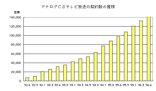 アナログCSテレビ放送の直接受信契約数が14万世帯を突破した。CS局全13社の合計は6月末現在で14万2,250世帯であった。 内訳はスカイポートが83,035世帯、CSバーンが59,214世帯となっている。各社とも今まで順調に契約数を伸ばしていたが、6月は月間契約数の伸びが鈍化した。かねてからの予想どおり「デジタル多チャンネル放送」の影響によるものとみられる。 |
