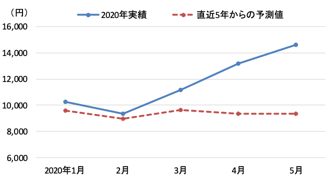 最後に、コロナがネット消費に与えたインパクトを推計した。消費には季節性があるため、月ごとに直近5年(2015~2019年)における1世帯当たりのネット消費額を用いて2020年の1月から5月に予想される消費額を予測した[3]。この予測値はネット消費が直近5年と同じ傾向で増加した場合の値であり、実際に1月と2月は実績値と予測値が概ね同じ規模となっている。ところが4月は3,822円、5月は5,270円も実績値が予測値を上回っており、コロナによるネット消費増加の影響が表れた結果だと言える。これは、二人以上世帯における平均的なネット消費額であるため、日本全体のインパクトを推計するため、二人以上世帯数(3,686.6万世帯[4])を乗じると4月と5月の2カ月で合計3,352億円となった。これは二人以上世帯における2020年2月のネット消費額に匹敵する規模であり、コロナは5月までにネット消費額を約1カ月分増加させるほどのインパクトをもたらしたことになる。