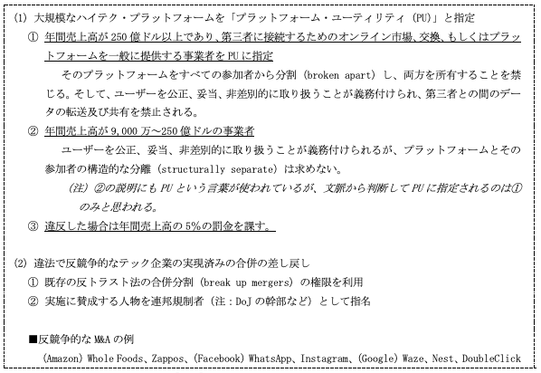 この選挙公約のポイントを表2にまとめたが、注目されるのは、売上高が巨大なプラットフォーマーを「プラットフォーム・ユーティリティ(utility)」に指定し、そのプラットフォーム事業と他の事業を分割(broken apart)するという主張である。通常、ユーティリティとは、電力、ガス、鉄道などの公益事業を意味し、欧米ではインフラとサービスの垂直分離(上下分離)が行われているケースが少なくない。GoogleやAmazonについて、そのプラットフォーム基盤を一種のインフラと見なし、コンテンツ、アプリケーション、サービス、データを流通・交換する事業から構造的に分離しようという発想である。また、既に承認されているM&Aのうち、潜在的ライバルの芽を摘むなどの反競争的な目的で行われた可能性のある事案について再度の審査を行い、再分割を求める考えも示されている。共和党などから急進左派と評されていたウォーレン議員ならではの過激な公約に思われるかもしれないが、「分割」、「過去のM&A批判」は前述の下院司法委員会の公聴会でも指摘されていた通りである。また、後段で紹介するシカゴ大学の報告書にも、プラットフォーマーのM&A審査基準の見直しの指摘が存在することから、現在の米国では一部政治家の突飛な提案とは言えなくなってきている。