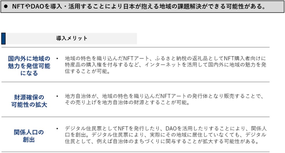 日本には魅力的な地域があるにもかかわらず、必ずしもそのような地域が活性化しているとは限らず、地域や自治体は人口減少やそれを背景とした財源減少などの課題を抱えている。現在、NFTやDAOを使った、そのような地域の活性化の達成や人口減少の課題解決への取り組みが進んでおり、論点と施策動向を以下の図にまとめた(図3)。