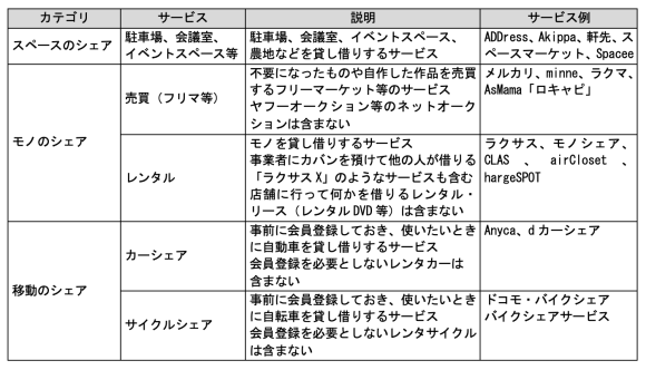 なお、ここで扱うのはシェアリングエコノミーの内の表1に示したサービスである。