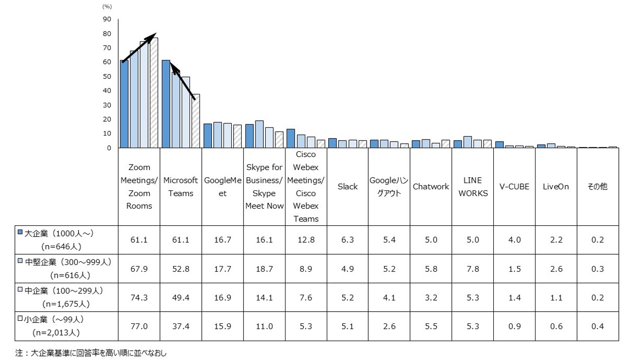 同Web会議活用層が活用しているアプリ・サービスでは、従業員規模に関わらず、Zoom、Microsoft Teams(以下、「MSTeams」という)の活用率が高い。なお、同上位2つのWeb会議用アプリ・サービスの活用層には特徴がある。Zoomは従業員規模が小さくなるにつれて、逆にMSTeamsは従業員規模が大きくなるにつれて、その活用率が高い。利用料金および同時活用可能なメンバー数の大小、セキュリティ等が選定理由となっているものと推察される(図10)。