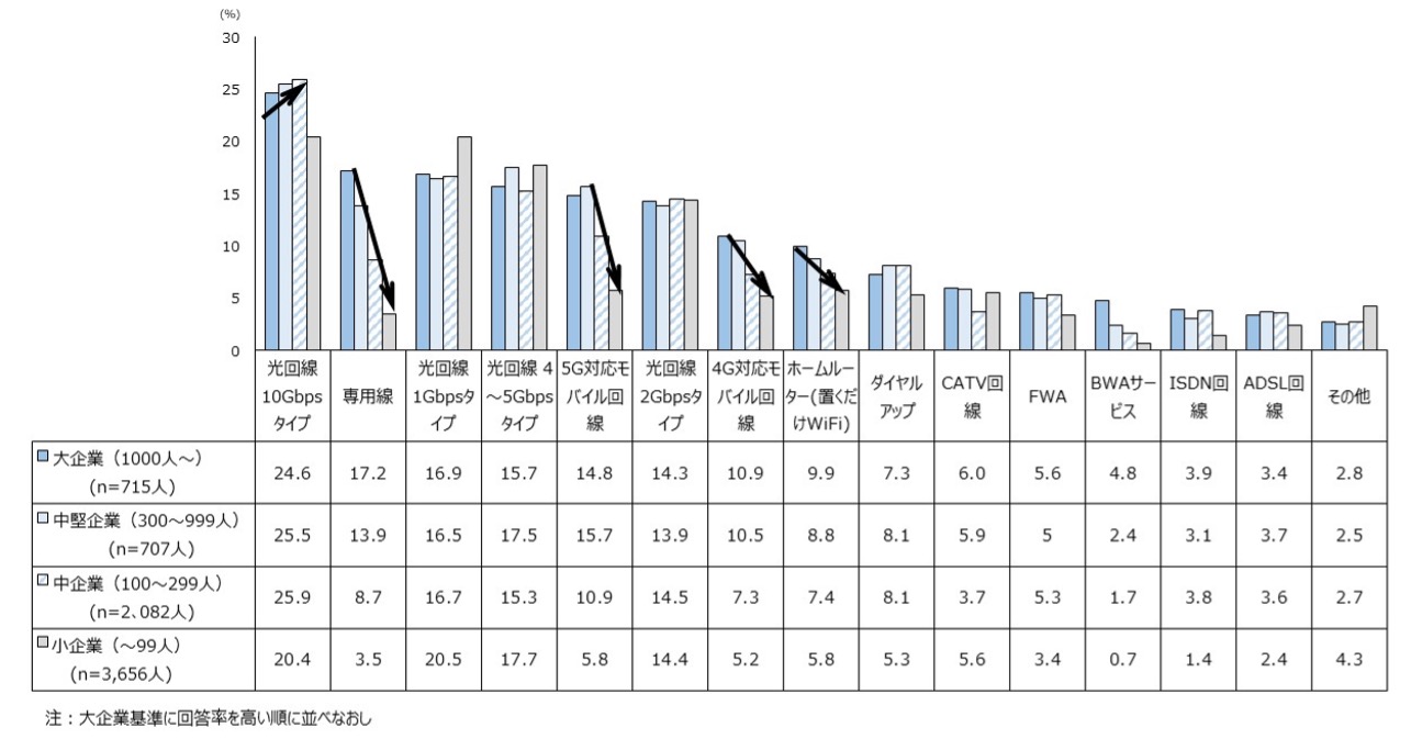 ここで、勤務先でのインターネット活用回線についてみてみる。なお、本データ結果は、飽くまでビジネスパーソン1人1人の個人による回答であり、企業または事業所のデータ結果ではない点に留意する必要がある。活用されているインターネット接続回線品目は多肢にわたっており、最も多く活用されているのが「光回線10Gbpsタイプ」で、大~中規模企業まで従業員規模が小さくなるにつれ活用率は高くなっている。小規模企業勤務層では「光回線1Gbpsタイプ」の活用率が、他の従業員規模企業の勤務層と比較して最も高くなっているが、あわせて「光回線10Gbpsタイプ」も同程度の活用率となっている。