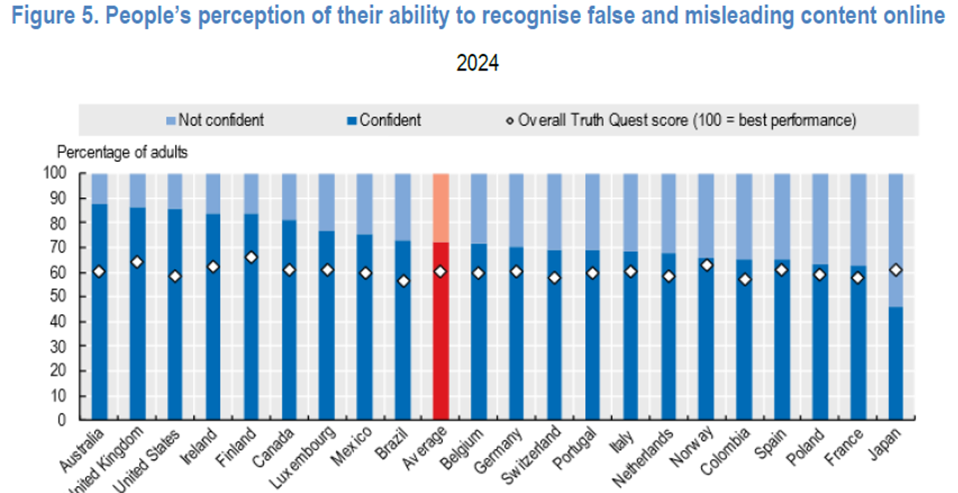 OECDは、本人が自覚するオンライン上の虚偽コンテンツの識別能力と、実際の識別能力との間には相関がないとする報告書[2]を発表した。“Truth Quest Survey”というこの報告書によると、オンライン上で虚偽や誤解を招くようなコンテンツを識別する人々の能力は、調査で測定された能力と相関がない。すなわち、フェイクニュースを見た、あるいはフェイクニュースを見分ける自信がある——といった本人の回答は、見たものが実際にフェイクニュースだった、あるいは、回答者に見分ける能力があるといった事実を必ずしも表さないことになる。