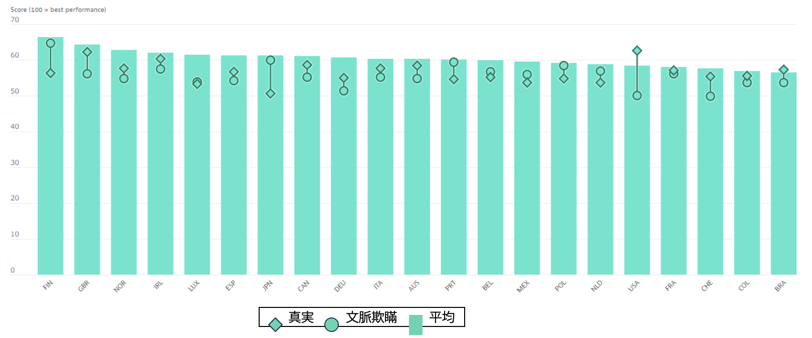 - 文脈欺瞞のスコアは、すべての国で総合スコアより低い。