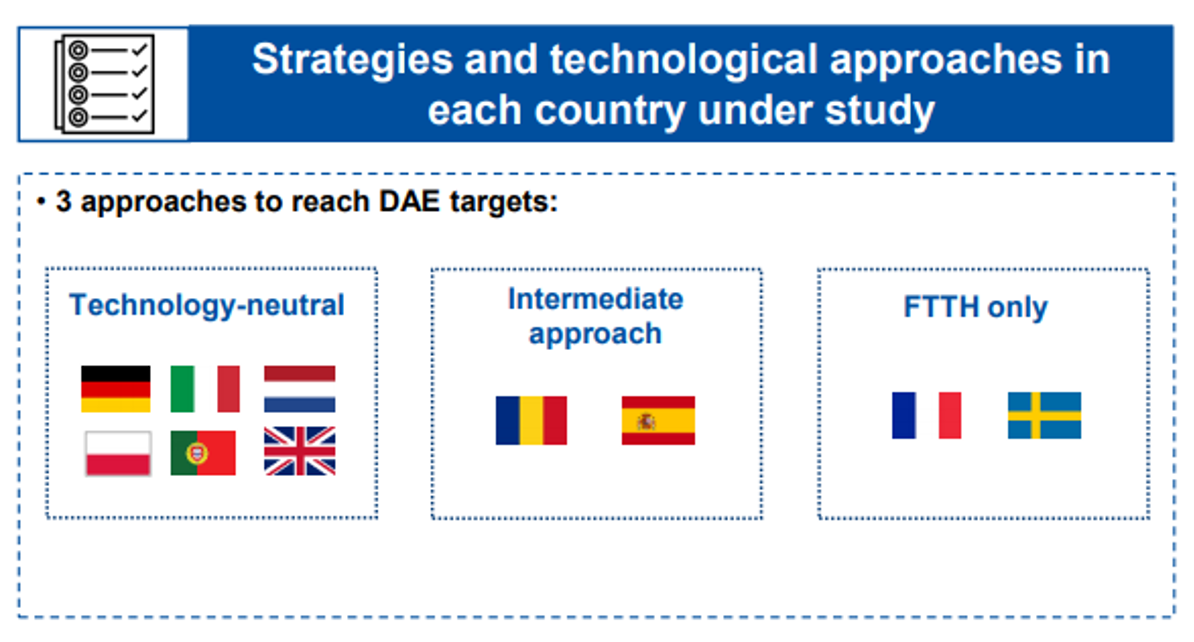 本誌2025年9月号にて述べたように、ECは2010年に「欧州デジタルアジェンダ(DAE)」情報化戦略を策定したが、その一環として、欧州域内の次世代ネットワークの整備を目的とした行動計画を策定するよう、各加盟国に要請していた。加盟国の取り組み状況を調査した業界紙(FTTH council Europe)によれば、当時、ドイツをはじめ多くの加盟国が目標達成のための接続技術を特定しなかった(これは「技術中立性」の原則に合致する)のに対して、FTTH技術のみを選択したのは、フランスとスウェーデンの2か国だけであったことが、簡潔に報告されている(図1参照)。