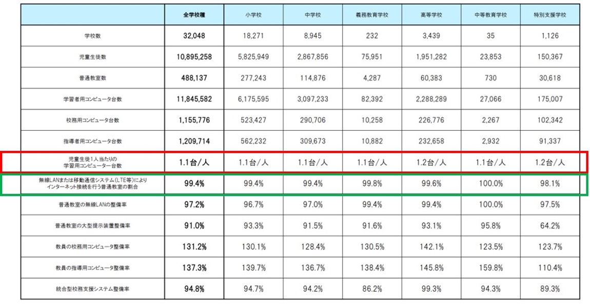 図1は、文部科学省の調査[1]結果に基づき、学校における主なICT環境の整備状況について最新データをまとめたものである。