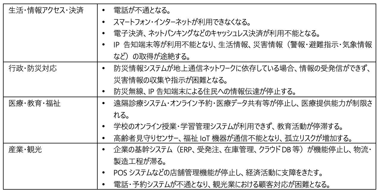 通信インフラは現代社会の基盤であり、その機能停止は行政・防災・医療・教育・金融・物流など、社会全体の機能に波及する。このため、特に地域金融機関や物流・医療機関が単一の通信網に依存している離島や山間部では、通信障害が発生すると、あらゆる活動が制約を受けることになる(表1)。