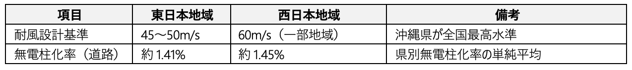 西日本地域では、台風常襲地帯を中心に高耐風設計が早期から導入されており、コンクリート柱に加え、鋼管柱やFRP柱などの軽量・高耐風型素材が採用されているエリアもある。一方、無電柱化率については、東西で大きな差は見られないが、東日本地域では東京都のみが突出して高く(約5.2%)、東北地方などでは遅々として進んでいない状況にある。このため、同規模の自然災害が東西で等しく発生した場合、より大きな被害を受ける可能性が高いのは東日本地域であると考えられる。