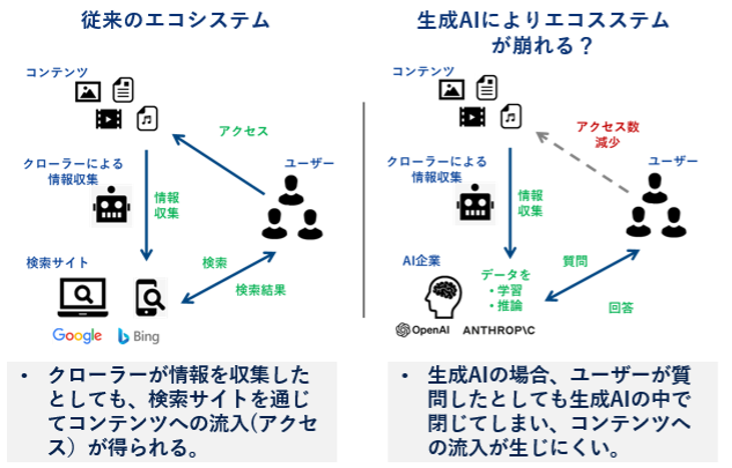 この差は、生成AIが従来型のエコシステムを崩壊させ、コンテンツホルダーにとって「無断利用されるだけ」の状況を生み出していることを示している。余談ではあるが、筆者が自社顧客向けにコンテンツを制作する企業の担当者に、本件のような現象が実際に発生しているのかをうかがったところ、「詳細は話せないが、アクセス数はおよそ半分程度に減少した」との話を得たことがある。