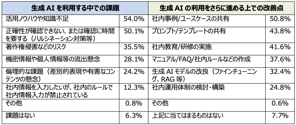 また、生成AIの利用をさらに進める上での改善点については、社内事例/ユースケースの共有(50.8%)が最も多く、プロンプト/テンプレートの共有(43.8%)、社内教育/研修の実施(41.6%)と続いています(図表3)。