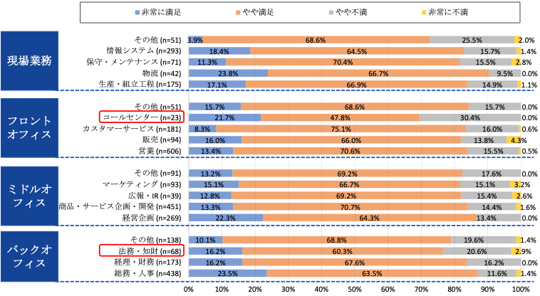 生成AI利用に対する満足度については、全体的に満足(非常に満足、やや満足)が多いものの、個社特有の情報や専門用語等を多く扱うと想定される「コールセンター」や「法務・知財」部門で働く従業員はやや不満に感じる割合が多くなっています。
